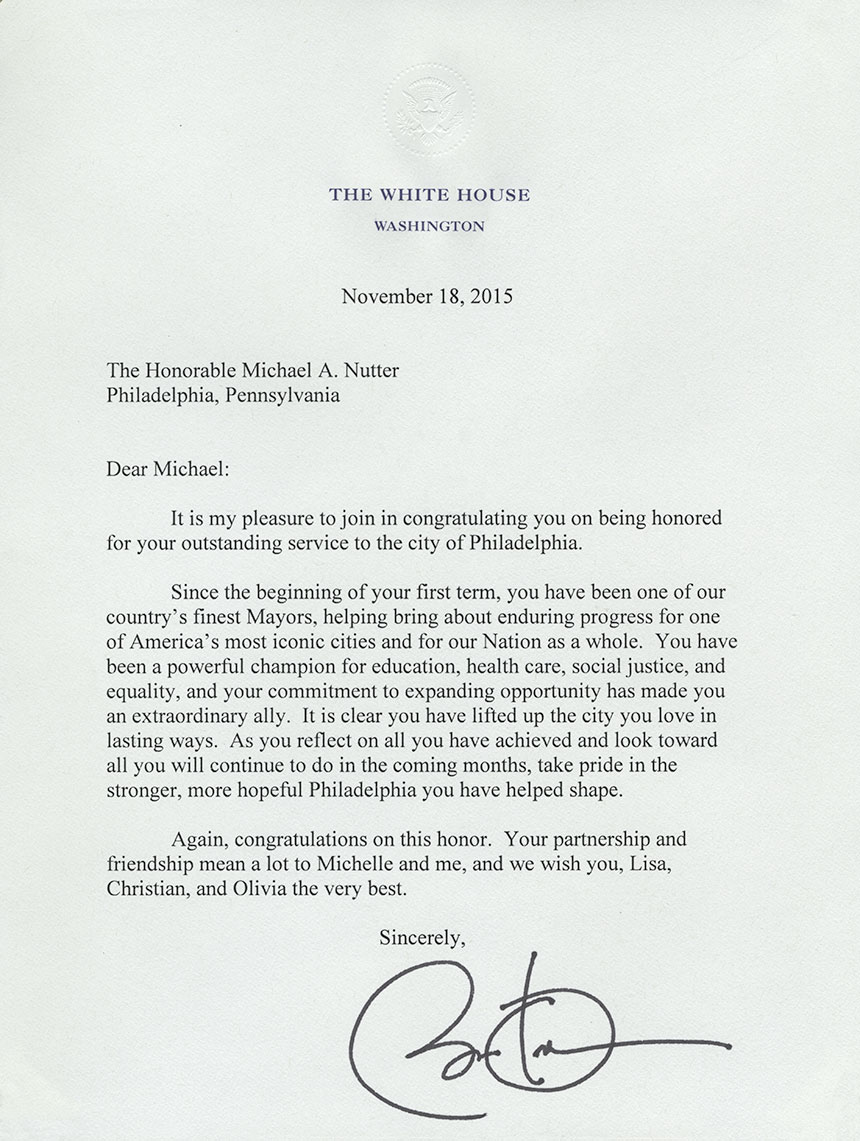 Since the beginning of your first term, you have been one of our country's finest Mayors, helping bring about enduring progress for one of America's most iconic cities and for our Nation as a whole. You have been a powerful champion for education, health care, social justice, and equality, and your committment to expanding opportunity has made you an extraordinary ally. It is clear you have lifted up the city you love in lasting ways. As you reflect on all you have achieved and look toward all you will continue to do in the coming months, take pride in the stronger, more hopeful Philadelphia you have helped shape.